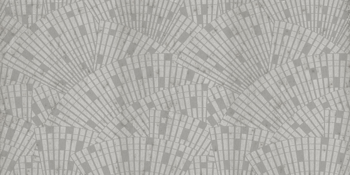 Beschrijving: Muurbekleding van echte metaalfolie met een geoxideerd effect en een toon-op-toon print, sommige referenties afgewerkt met een laagje satijnlak