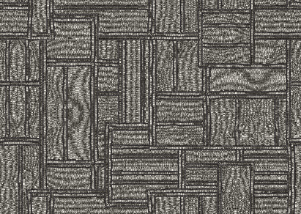 • Beschrijving: Muurbekleding met high-tech reliëfinkten en een dessin gebaseerd op ‘quillwork’ van de Paleo Indianen